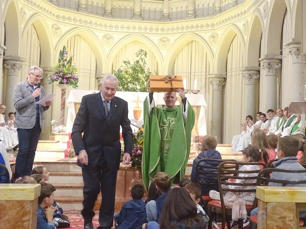 ...dopo la Comunione è seguito il saluto del Sindaco e del rappresentante delle Comunità Parrocchiali; l'offerta di un omaggio floreale ad Anna e Livio, genitori Don Nicola e la consegna di un nuovo computer portatile a Don Nicola, sicuramente molto utile nel nuovo impegno pastorale che sta per intraprendere. La serie di interventi si è concluso con il saluto augurale del Vicario Foraneo Mons. Livio Carlino, con il dono di una riproduzione longobarda della Croce di Gisulfo...